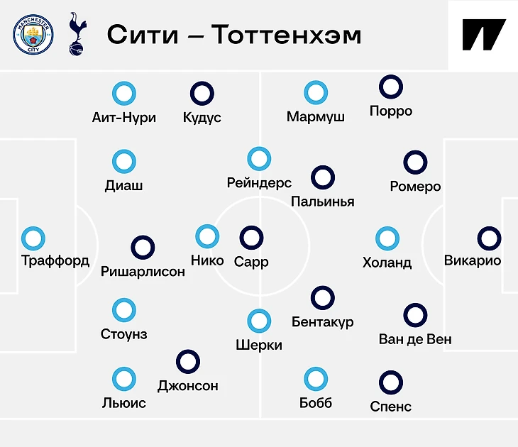 По сравнению с первым туром Пеп внес пару изменений, состав стал чуть более атакующим благодаря появлению Райана Шерки и Омара Мармуша. Франк не стал переводить «Тоттенхэм» на пятерку защитников (ход из матча с «ПСЖ»), но опорную зону наполнил, как в Суперкубке – Жоау Палиньей и Родриго Бентанкуром.