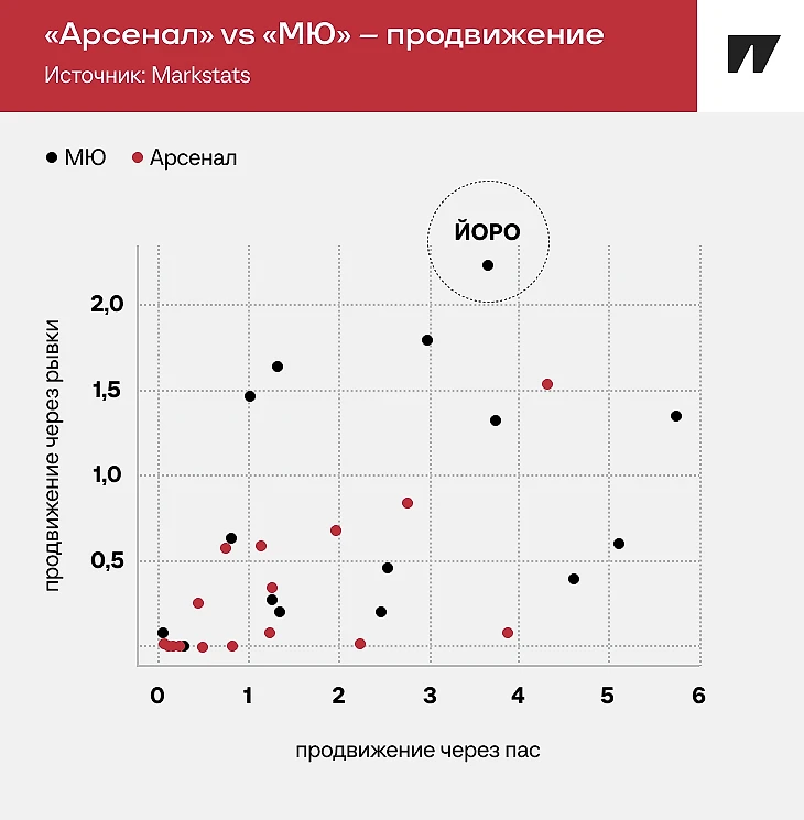 Прогресс в обороне объясняет изменение среды: «Лилль»-2023/24 вошел в топ-5 Лиги 1 по ожидаемым очкам, в топ-3 по допущенным xG и стал второй командой Франции после «ПСЖ» по проценту владения. У Йоро было попросту меньше эпизодов для отборов и перехватов. «МЮ»-2024/25 на другом полюсе: владение вроде есть (шестые в АПЛ), но только 13-е место по качеству обороны (допущенные xG с игры).