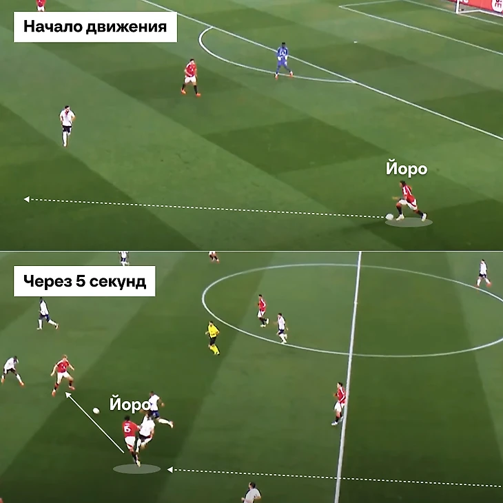 Рывки с мячом раскрывают другую грань Йоро – Лени универсален и закрывает любую позицию в тройке. В примерах выше он тащил мяч с позиции левого ЦЗ. В первом туре нового сезона играл справа и был финальным звеном цепочки с Алтаем Байындыром и инвертированным в опорную ЦЗ. Каземиро и Де Лигт получали пас от вратаря, в касание отдавали на Йоро, Лени тащил мяч вперед.