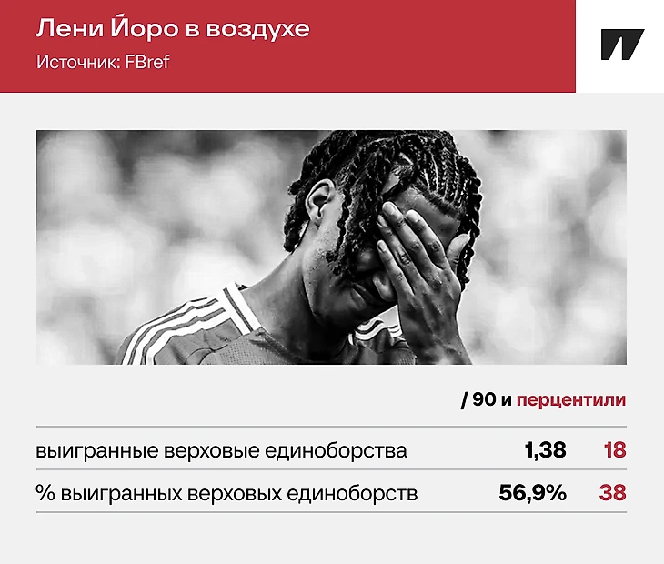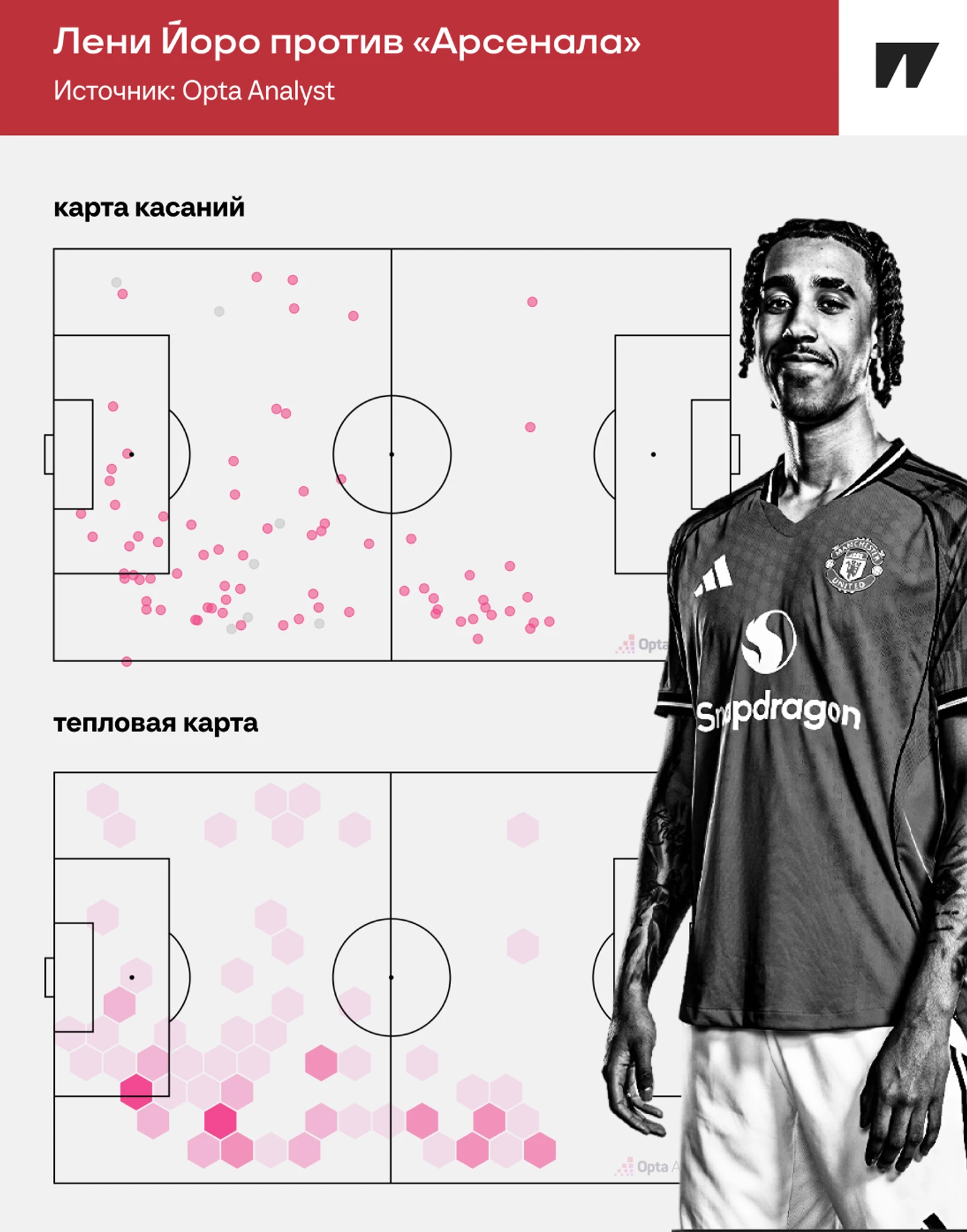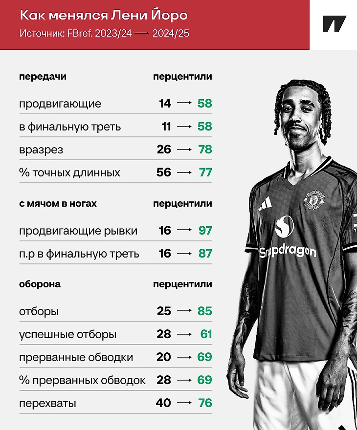 Лени интегрировали в старт в тяжелый зимний отрезок: «МЮ» только вникал в основы философии Аморима и коллекционировал поражения (шесть в девяти декабрьских матчах). Для Йоро задача усложнялась не только адаптацией к новой схеме (раньше Лени не играл в тройке), но и скачком в уровне сопротивления – в Лиге 1 так много сложной работы в обороне не было.