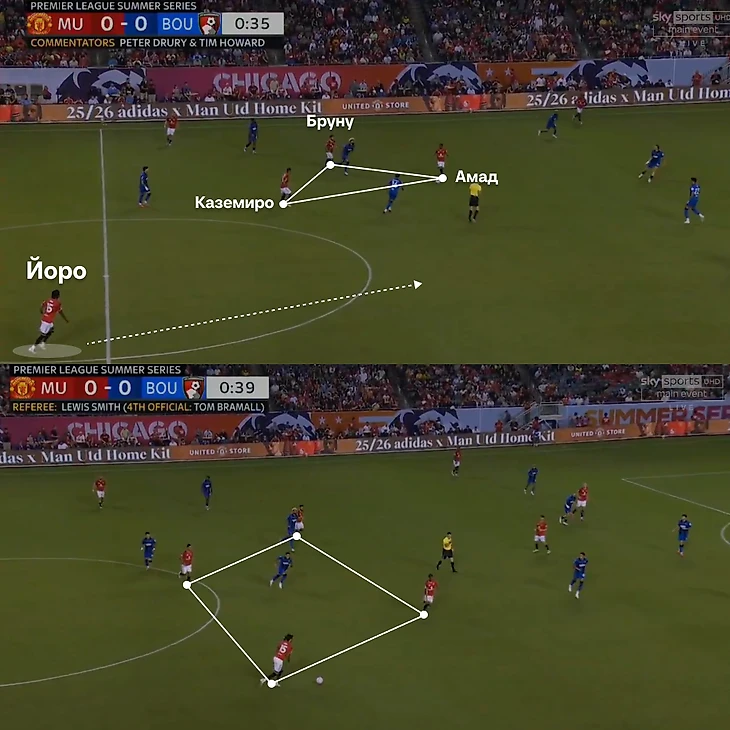 Потолок универсальности Йоро, похоже, не нащупал даже Аморим, но эксперименты есть. На предсезонке попробовали такое – при владении Йоро поднимался в опорную и формировал ситуативный ромб с Амадом, Каземиро и Бруну, «Юнайтед» получал дополнительного игрока в центре.