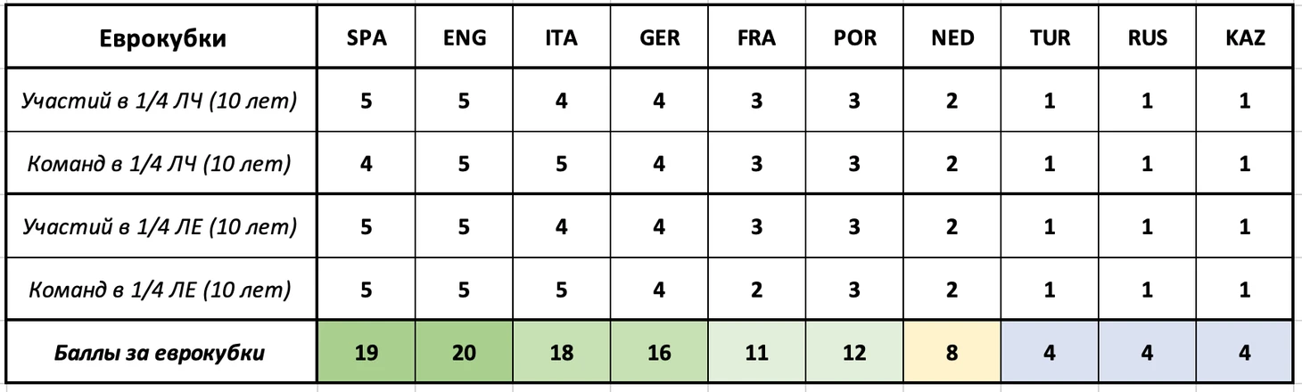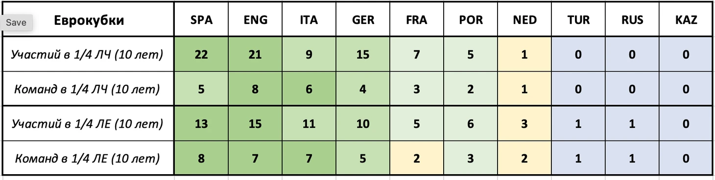 Тут 2 абсолютных лидера – Англия и Испания, что в принципе интуитивно было очевидно, это самые сильные лиги Европы и мира – у них 43 участия в 1/4 ЛЧ за 10 лет – более 50% всех участий и более 28 участий в аналогичной стадии ЛЕ, где у них тоже нет конкурентов. Правда команд в ЛЧ у Англии намного больше – 8 против 5 – что большой плюс, тут испанцы проиграли даже итальянцам. Германия и Италия идут следом – причем Германия имеет больше участий в топ-8 ЛЧ – но в основном за счет Баварии, команд у Италии больше. В ЛЕ у Италии больше и участий и команд. Франция и Португалия имеют очень близкие показатели, Нидерланды сильно позади, Турция и Россия имеют по 1 выходу в четвертьфинал ЛЕ, для Казахстана это пока только мечты.