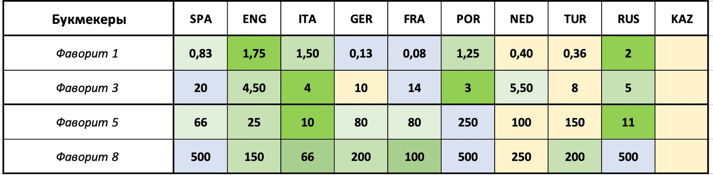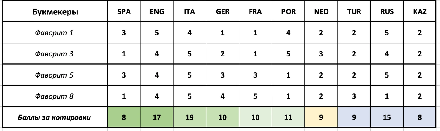 Решили взять ставки на фаворитов под номерами 1, 3, 5 и 8 – чтобы понять как много команд в принципе претендуют на титул. Тут по котировкам главного фаворита чем больше коэффициент тем лучше – по 3, 5 и 8 – наоборот – чем ниже тем лучше. По Казахстану к сожалению надежных данных по котировкам на титул не удалось найти – поэтому они получат средние 2 балла по всем пунктам. Чемпионаты Англии и России выглядят самыми конкурентными с точки зрения шансов главного фаворита – правда у нас шансы имеют только до топ 5-6 – дальше пропасть. В Англии немного ровнее – все видимо все еще помнят чудо-подвиг «Лестера». Во Франции худшая ситуация по главному фавриту – но зато почти лучшая по 8-му. Самый непредсказуемый в целом чемпионат видимо итальянский – там 5й фаворит вполне себе может стать чемпионом, да и 8-й фаворит какие то шансы все же имеет.