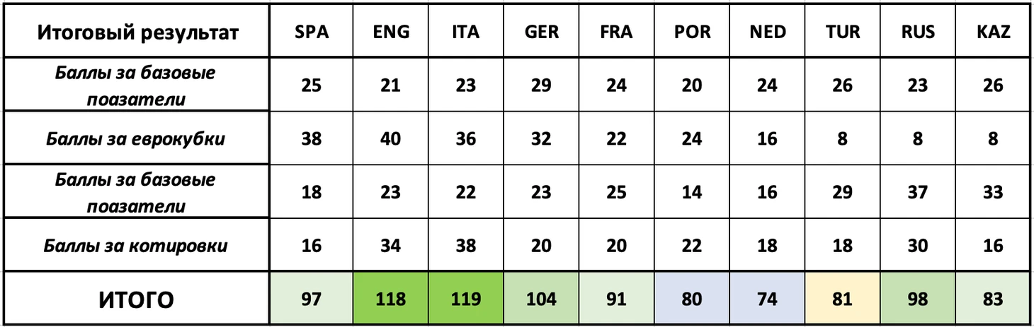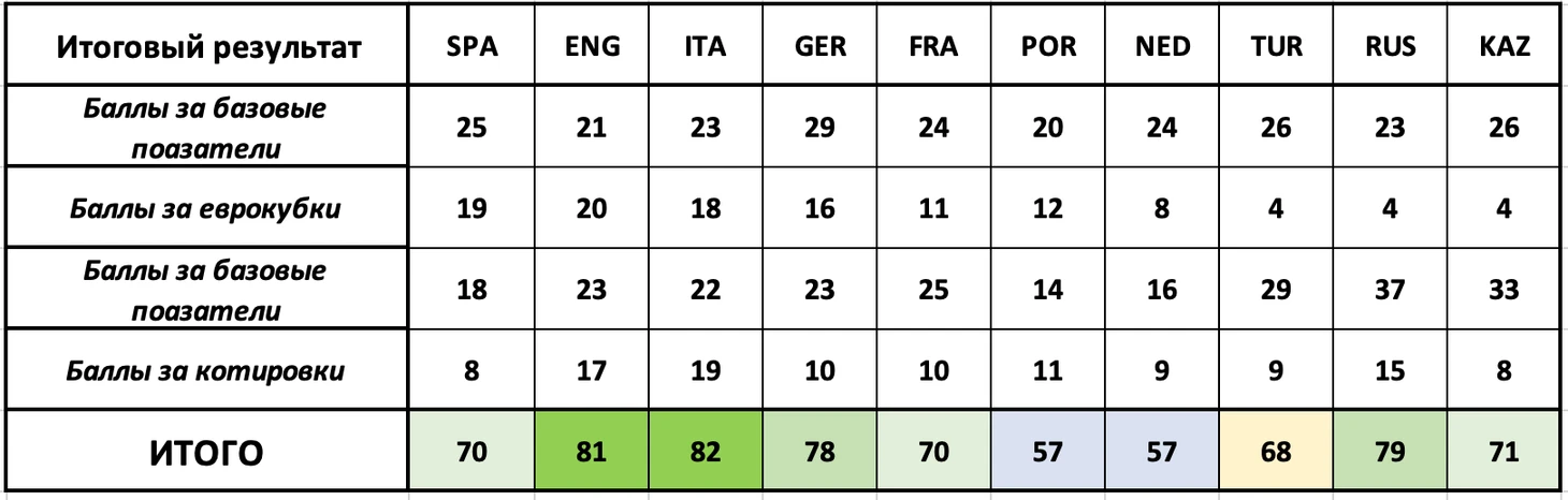 Здесь самым интересным чемпионатом становится итальянский – 82 балла. Следом идет АПЛ – 81, всего 1 балл отставания. Далее – родная РПЛ – которая весьма достойно смотрится на фоне топов – 79 баллов. Несмотря на отсутствие успехов в еврокубках. Совсем рядом Германия – 78. А вот Испанию смотреть оказывается не очень интересно – на уровне Казахстана. Да в еврокубках блистают – но в целом низкая результативность, 2 фаворита на титул, мало призеров и тд делают в целом Ла Лигу не такой уж интересной.