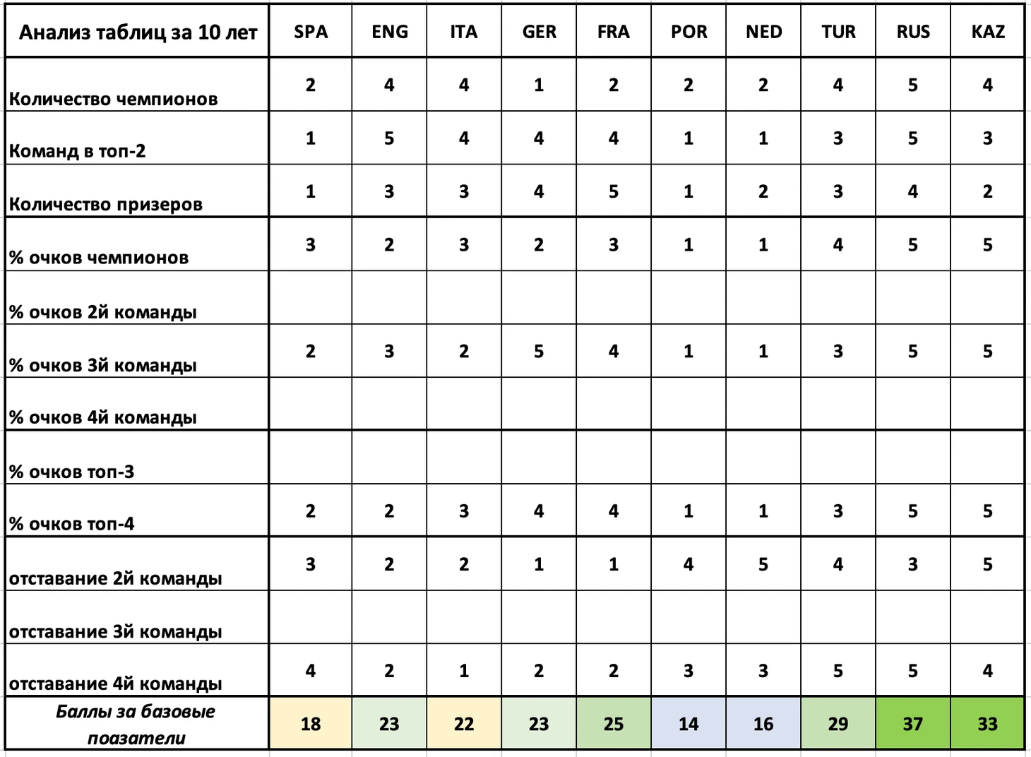 Анализ проводился по 4-м направлениям – базовые индикаторы привлекательности турниров, качество футбола, анализ итоговых таблиц за 10 лет и изучение котировок букмекеров.