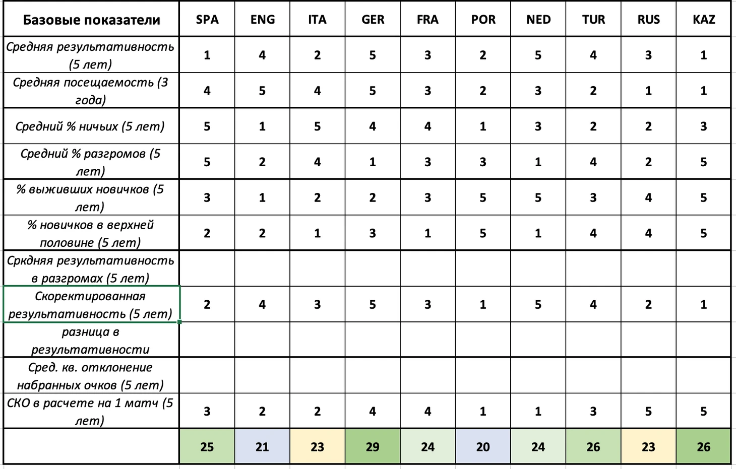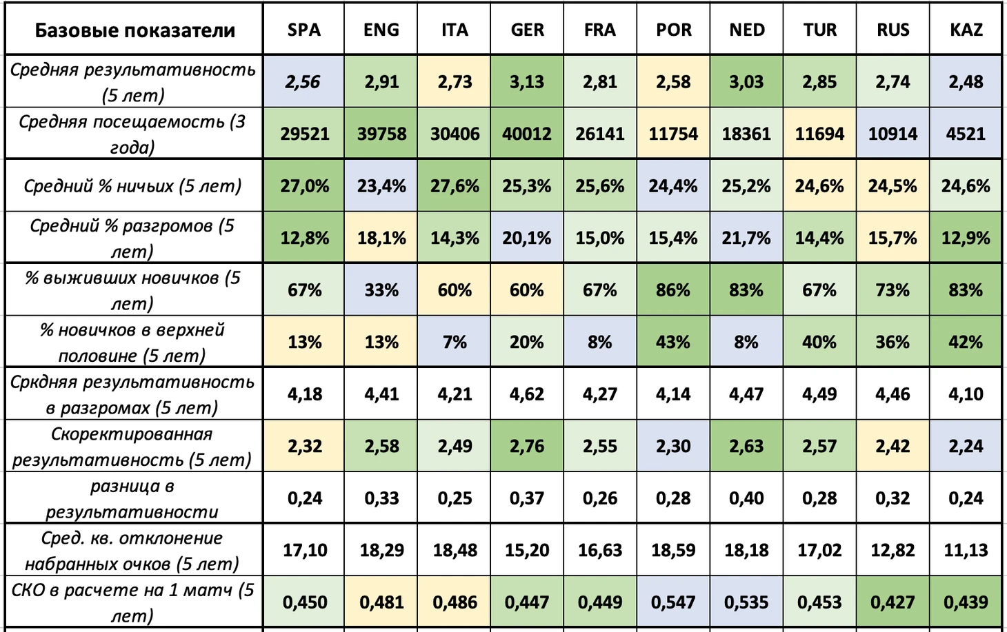 Ну и отдельный очень важный показатель – среднеквадратичное отклонение всех команд по набранным очкам за последние 5 сезонов – показывает насколько в целом таблицы чемпионатов плотные. Общий показатель СКО тут не очень работает – чем меньше команд в лиге тем понятнее меньше будут разрывы между командами. Но если взять очки в среднем за матч за сезон – то уже гораздо интереснее. Мы видим что самые плотные таблицы даже с учетом очков за матч именно в России и Казахстане. Вероятно малое количество команд (16 и 14) тут имеет двойной эффект – кроме меньших разрывов это влияет и на меньшее количество явных аутсайдеров (хотя и в РФ и в РК они бывали – но видимо не в таком количестве как в топ-5 где играют по 20 команд). Хотя безусловно в той же Англии с сотнями профессиональных команд 20 команд АПЛ это скорее всего намного меньшая вершина пирамиды чем 14 команд в Казахстане. Но тем не менее тут Россия и Казахстан лучшие. Немного им проигрывает Франция, Испания и Германия. А вот в Нидерландах и Португалии все очень плохо – хотя там 18 команд, а не 20 как в Испании и Германии – но таблицы у них крайне неоднородные и разрывы между командами в среднем намного выше. Более системный анализ итоговых таблиц будет ниже – здесь только ключевой показатель расслоения – СКО.