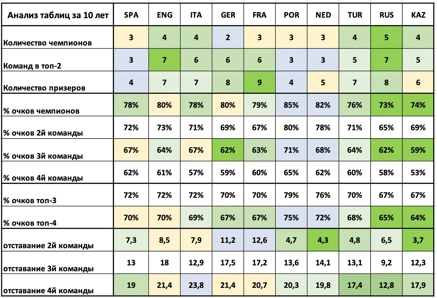 Начнем с анализа количества чемпионов. Тут нет конкурентов у РПЛ. С одной стороны вроде бы Зенит выиграл 6 турниров из 10 – причем 6 подряд. Но оказывается остальные 4 выиграли 4 разные команды – даже Спартак и Локомотив – и 5 чемпионов за 10 лет это лучший показатель в Европе, по крайней мере из анализируемой десятки. Интересно есть ли чемпионаты где чемпионов было больше? В Англии, Италии, Казахстане и Турции было 4 разных чемпиона, а вот в Германии только 2 – причем Бавария выиграла 9, а Байер только 1. Это самая неконкурентная лига с точки зрения выявления чемпиона.