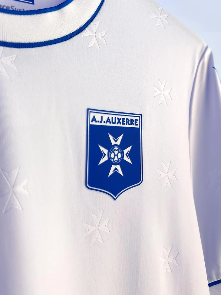 Домашняя футболка «Осера» выполнена преимущественно в белом цвете, сохраняя при этом культовый стиль клуба. Она имеет классический круглый вырез горловины и манжеты, украшенные светло-голубыми полосками.
