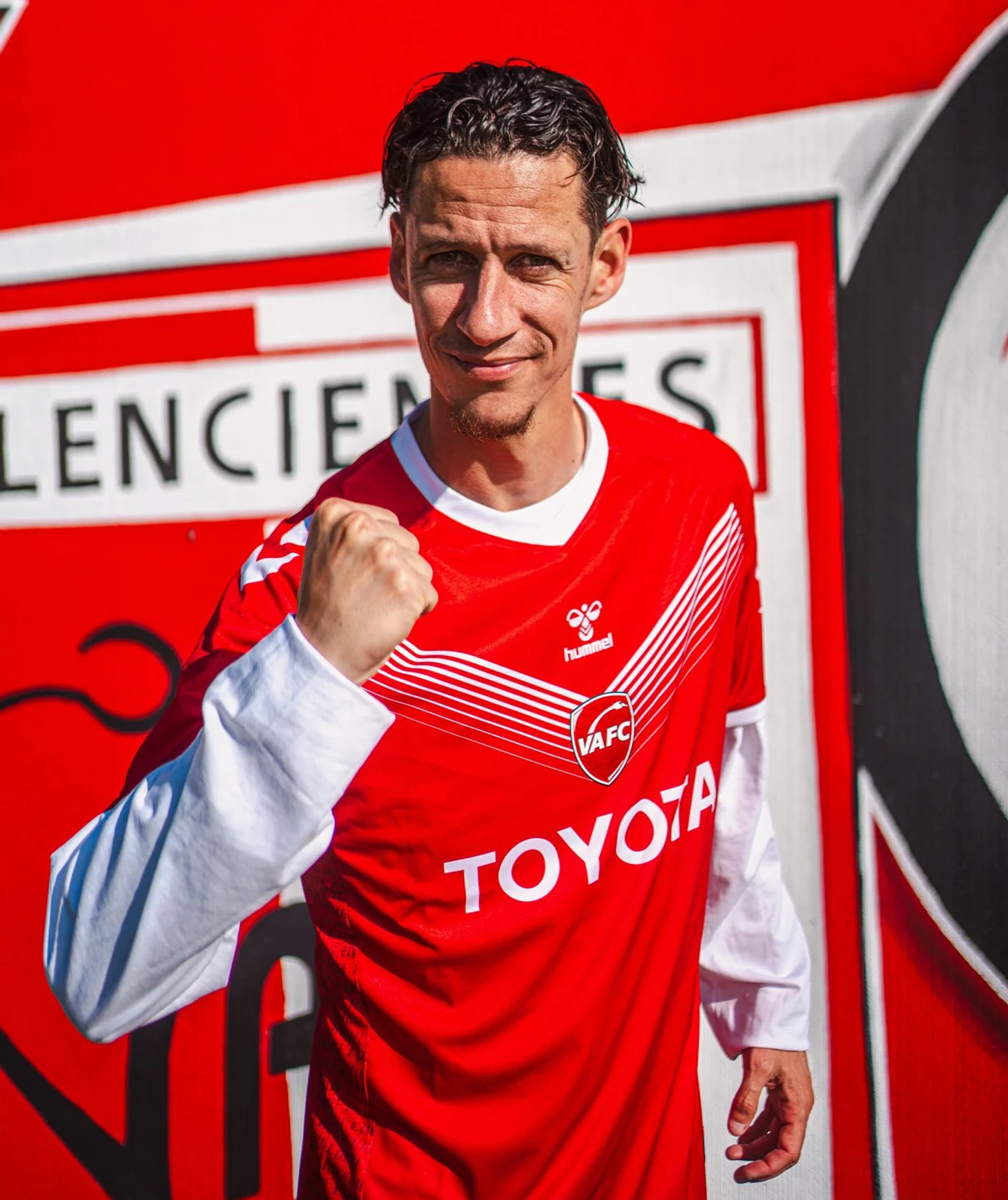Домашняя футболка «Валансьена» выполнена в традиционном дизайне клуба. Красный цвет корпуса сочетается с белым шевроном с градиентным рисунком.