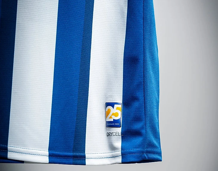 Домашняя форма украшена классическими вертикальными полосами клуба синего и белого цветов. Полосы имеют традиционную ширину и покрывают переднюю и большую часть спины.
