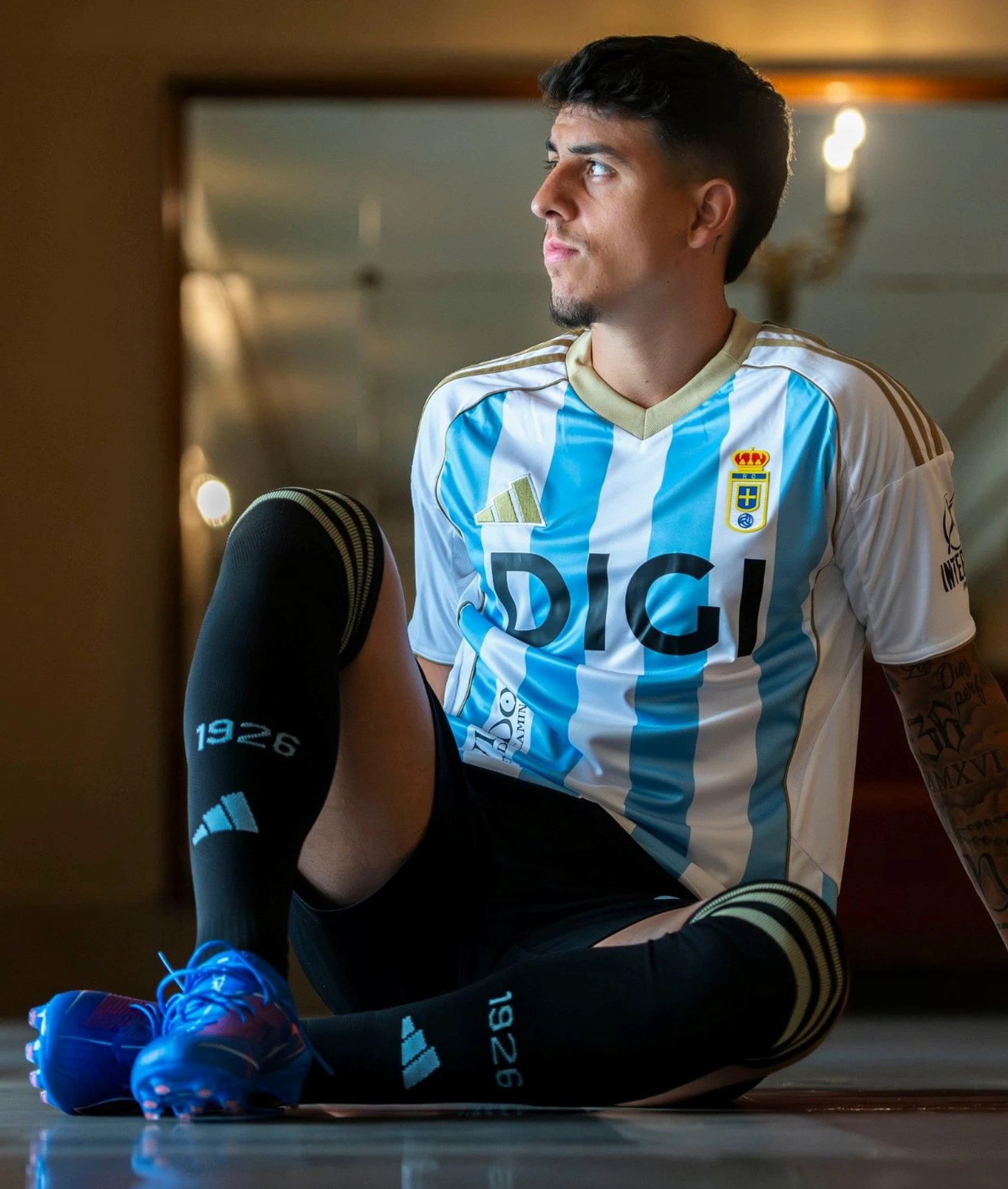 Третья футболка выполнена в более легком стиле «сборной Аргентины» с чередующимися светло-голубыми и белыми полосками, отсылая к эмблеме второго клуба-основателя – «Реал Клуб Депортиво Овьедо».