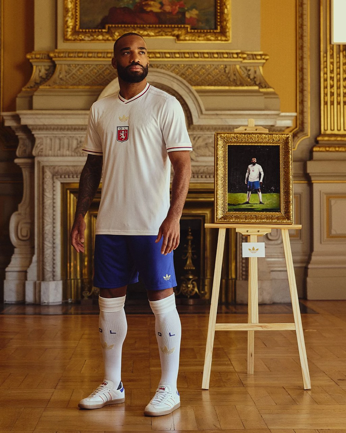 Минималистичная белая футболка украшена тонкими вертикальными полосками и красно-синей отделкой на воротнике и манжетах. Над гербом расположен золотой трилистник, а памятная этикетка на подоле отмечает годовщину 1950–2025 годов. Образ дополняют синие шорты и белые гетры, украшенные золотыми инициалами OL.
