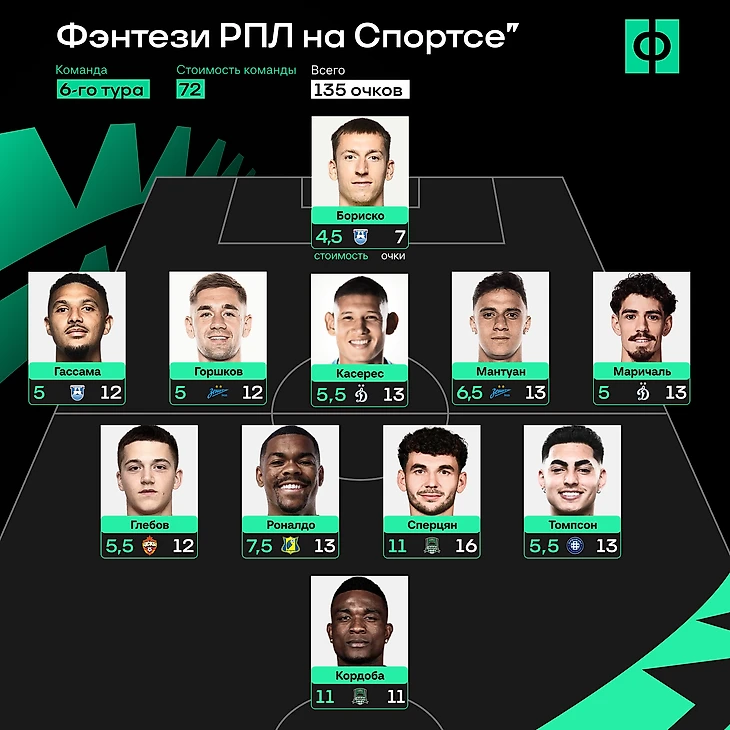 Перед вами сборная 6-го тура фэнтези-турнира по РПЛ: