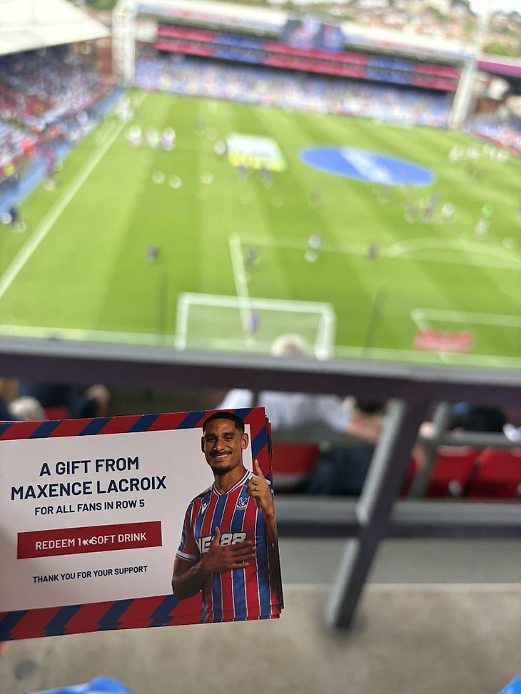 Приятный жест от Максанса Лакруа из «Кристал Пэлас» – француз проставил безалкогольный напиток всем болельщикам с пятого ряда (5-ка – игровой номер Лакруа).