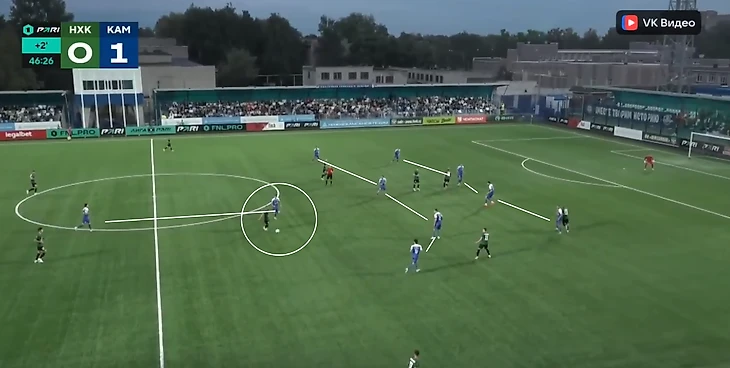 При выходе из обороны клуб из Набережных Челнов использует достаточно современную структуру, которая заточена на более быструю доставку мяча вперед. Построение 2-4-3-1 начинается с владения мячом, так хотят поднять линию прессинга соперника и освободить определенные коридоры. Если не получается, футболисты «КАМАЗа» просто разными способами двигают мяч выше, прижимая соперника.