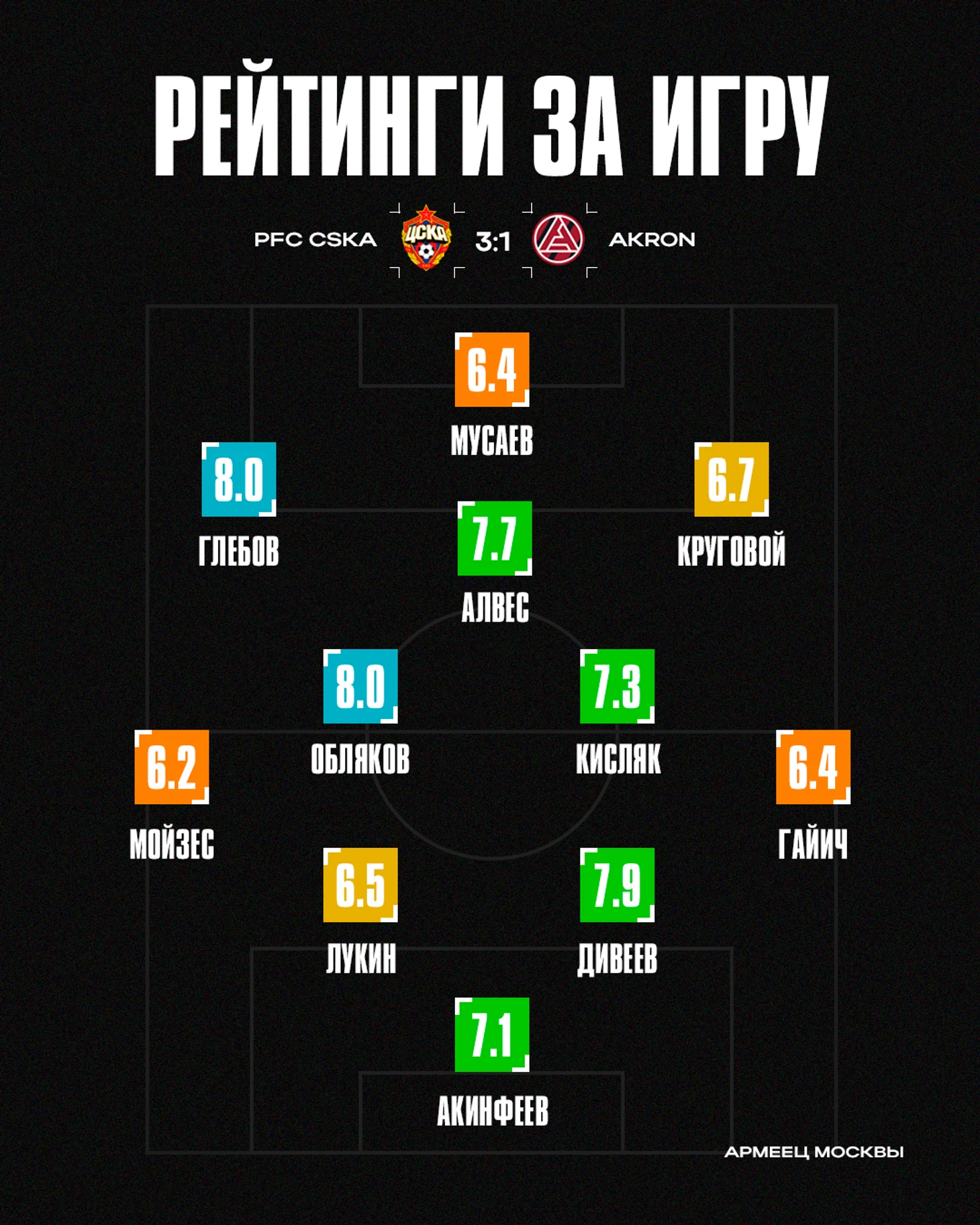 За свои 30 минут Артём успел стать по рейтингу от Sofascore одним из лучших по всему матчу (7,3). Виктор получил неплохие 6.9, а Руис стал вторым худшим игроком в составе ЦСКА — всего 6,3.