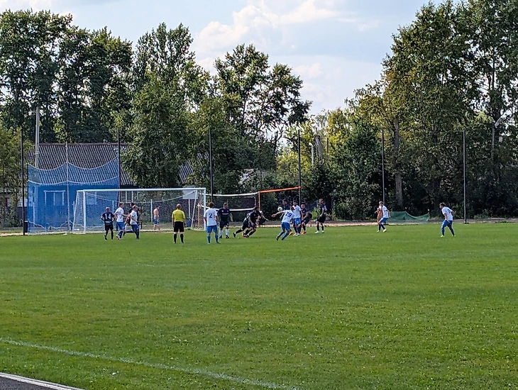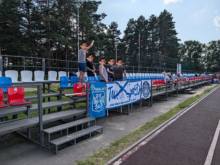 На матче присутствовало порядка ста человек. Здорово, что у команды была и активная поддержка. Респект парням, мощно заряжали🔥 Мачт проходил в последнее воскресенье июля, в День ВМФ⚓ Двое парней были в тельниках и бескозырках, разместили Андреевский флаг. Ну и конечно же, два ящика пива, которые пацаны притаранили с собой, придавало еще большего антуража⚪🔵