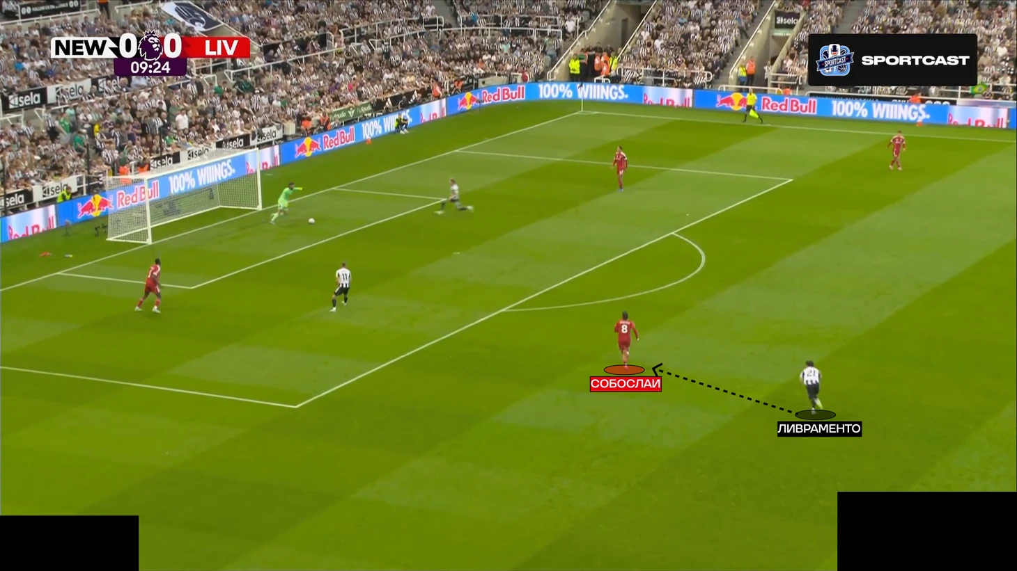 Мы уже выяснили, что во время владения мяча Собослаи уходит в опорную зону к Гравенберху. Таким движением «Ливерпуль» хотел получить перевес в этой части поля, но у «сорок» был свой ответ – это Тино Ливраменто. Крайний защитник следовал за Собослаи, идя за ним вплоть до чужой штрафной. Таким образом, «Ньюкасл» накрывал «Ливерпуль» во время билдапа.