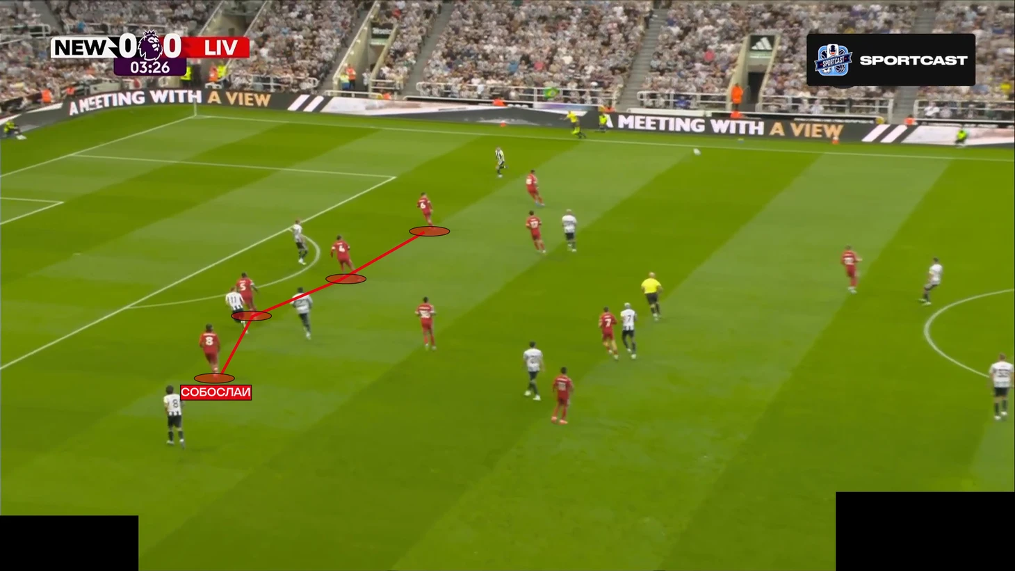 Но «Ливерпуль» находил свои подходы. Помогали своевременные смещения Собослаи с опорной зоны выше. Доминик уходил в полуфланг, создавая перегруз 2 в 1, что помогало гостям в продвижении в финальной трети. Но гости не владели мячом столько, сколько бы им хотелось. «Ливерпуль» пытался сбавить темп «сорок», но чаще оказывался в защите.
