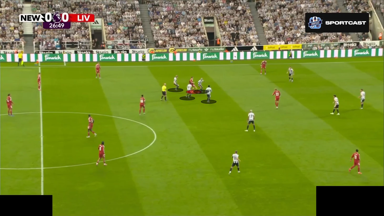 Центр «сорок» в лицах Тонали, Жоэлинтона и Бруно Гимараэса старались накрывать остальных игроков «Ливерпуля» – Виртца, Джонса, Гравенберха. Из-за высокой позиции Ливраменто, Салах мог оставаться 1 на 1 с Берном, но в первом тайме «Ливерпуль» просто игнорировал левый фланг, акцентируя свои атаки на противоположной стороне поля.