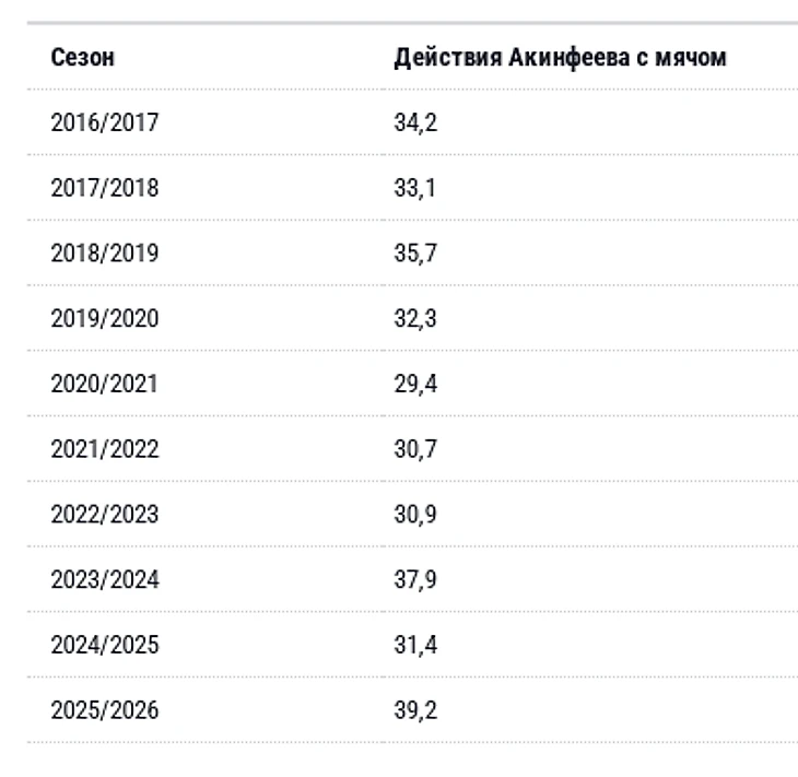 В сезоне-2023/2024 Акинфеев был 13-м по доле длинных передач от общего числа сделанных среди вратарей РПЛ, сыгравших более трети возможных минут — сразу 12 голкиперов чаще играли короче. В прошлом сезоне результат и доля чуть улучшились — Акинфеев стал 10-м. Август нынешнего года бессменный вратарь ЦСКА заканчивает лидером лиги по этому показателю: ни у одного вратаря, сыгравшего больше трети игрового времени, доля длинных передач не приблизилась к 33%, как у Акинфеева. Он стал играть значительно короче.