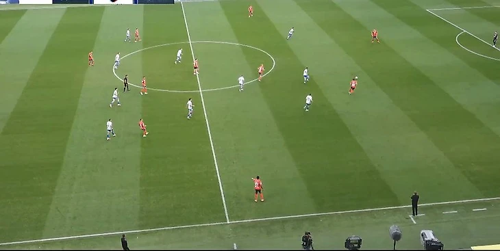 ЦСКА провёл первую волну атаки – безуспешно. Попытка развернуть мяч с фланга на фланг – безуспешно. Дальше армейцы отправляют сразу несколько передач назад, мяч доходит до Акинфеева, который играет ногами за пределами штрафной. Обратите внимание на игрока «Рубина», который находится в центральном круге: он размахивает руками, призывая всю команду пойти в прессинг. Ровно та ситуация, о которой мы только что говорили.