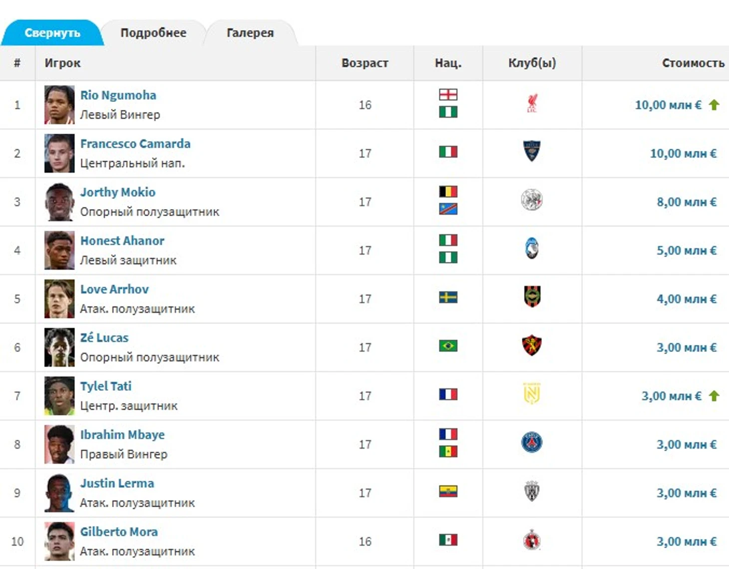 Рио делит первое место по трансферной стоимости с Франческо Камарда из «Лечче», права на которого принадлежат «Милану». Но итальянцу уже исполнилось 17 лет, тогда как Рио, исполнится 17 лет только через 2 дня - 29.08.2025.