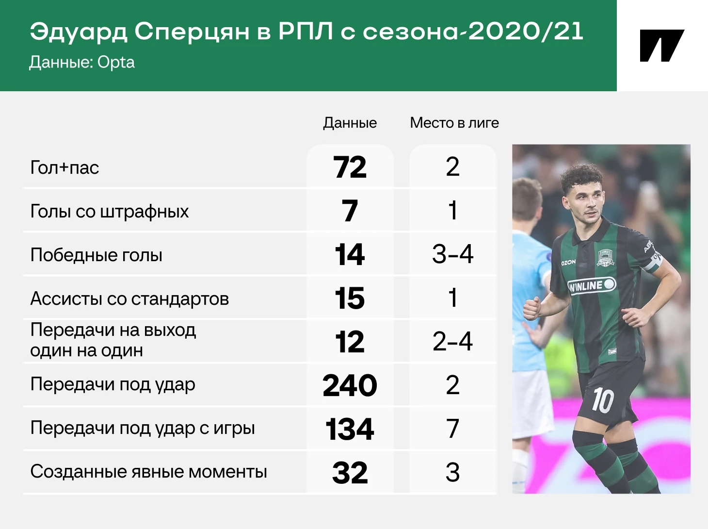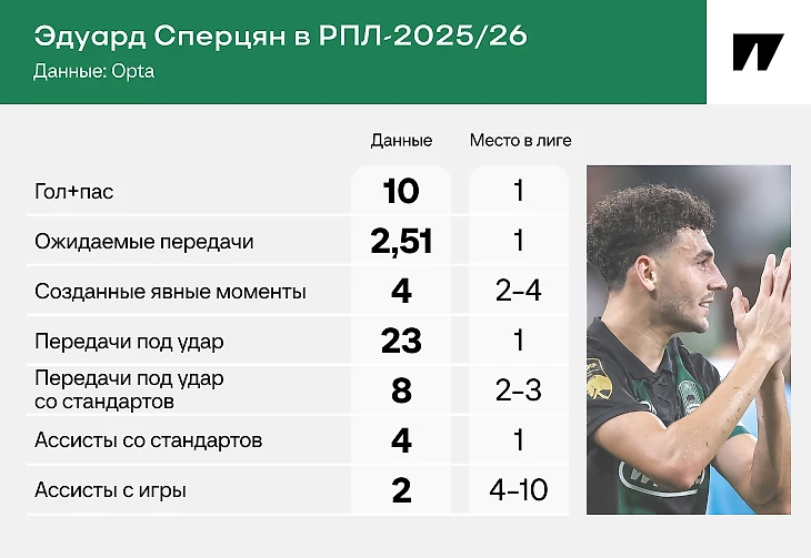 Сперцян проводит каждый матч лучше предыдущего на фоне слухов о возможном уходе отъезде и опасений в утрате мотивации: самый эффективный креативщик, прекрасен на стандартах, остр с игры, выбил шесть ассистов. В истории РПЛ после шести туров чаще ассистировал только Вендел-2024/25 (7).