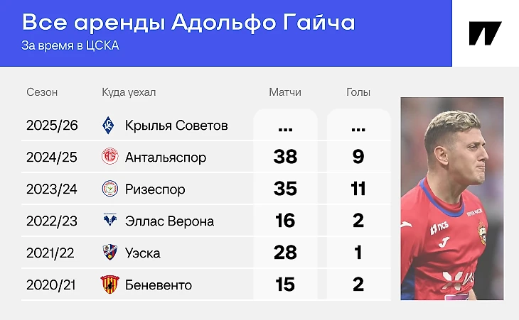 Гайча подписали из «Сан-Лоренсо» в августе 2020-го – за нападающего молодежной сборной Аргентины заплатили 8,5 млн евро. С тех пор Адольфо не провел за ЦСКА ни одного полного сезона – каждый год уезжал в аренду.