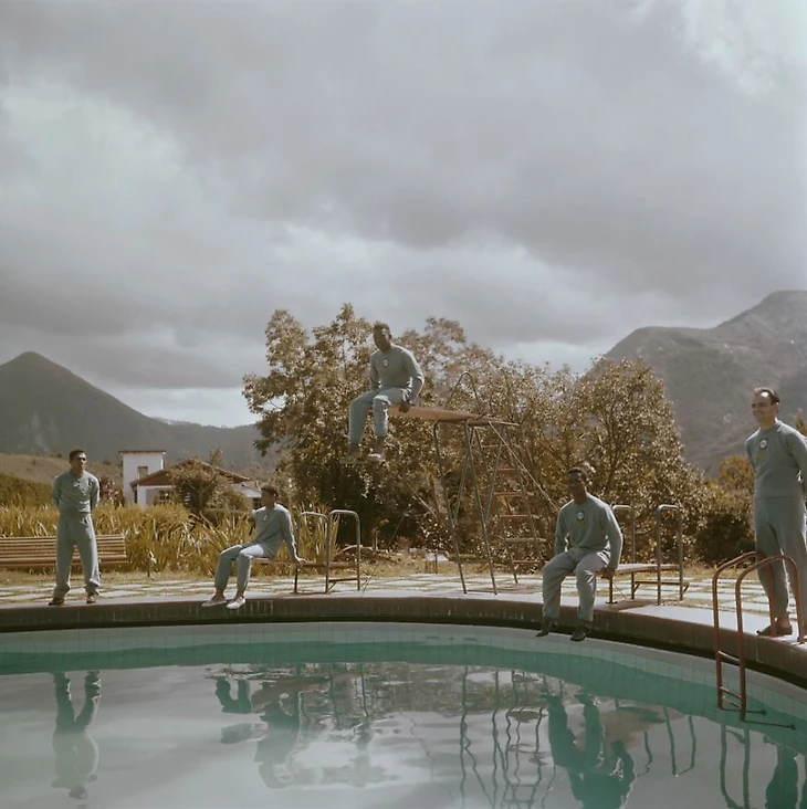 Пеле не сдерживает слёз, обнимая вратаря Жилмара дос Сантоса Невеша после победы Бразилии со счётом 5:2 в финале чемпионата мира 1958 года. В своих воспоминаниях Пеле писал: «Первое, о чём я подумал, — это моя семья. Знали ли они, что мы стали чемпионами? Я мечтал поговорить с родителями, но телефонов тогда не было, и я всё повторял: «Я должен сообщить отцу, я должен сообщить отцу». Связаться с ним удалось только спустя несколько дней через международное радио. Помню, как говорил: «Вы видели, как я стоял рядом со шведским королём? Приём» и «Я пожал руку королю. Приём». С тех пор многое изменилось».