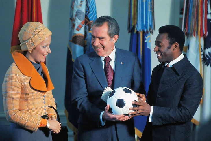 Свой последний матч за «Сантос» Пеле сыграл в октябре 1974 года, но, несмотря на финансовые трудности, уже через несколько месяцев вернулся на поле, приняв заманчивое предложение. К удивлению многих, особенно на родине, он подписал контракт с «Нью-Йорк Космос» из молодой Североамериканской футбольной лиги. За три года игры и ещё три года в роли «посла доброй воли» ему предложили 7 миллионов долларов. На этом фото Пеле вместе с Роземери посещает президента Никсона в Белом доме.