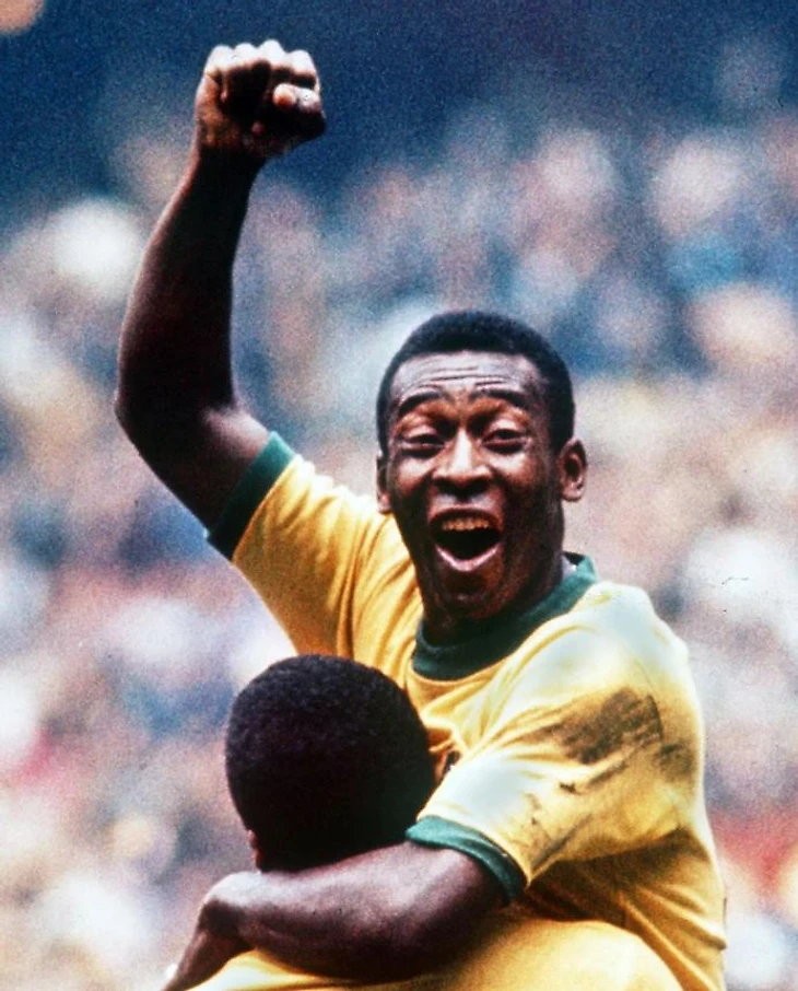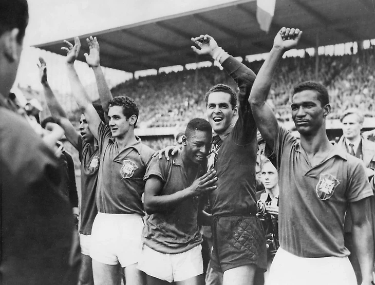 Пеле ликует, раскинув руки после того, как забил пятый гол Бразилии в финале чемпионата мира 1958 года против Швеции. В своей автобиографии он вспоминал: «Всё решило высокое навесное пасование: я обыграл двух защитников, пробил головой и увидел, как мяч влетает в угол ворот — это был пятый гол для Бразилии и мой второй в этом матче. Мы были в шаге от чемпионства. В этот момент я вдруг потерял сознание прямо у ворот. Гарринча подбежал и поднял мне ноги, чтобы кровь прилила к голове. Когда я очнулся, матч уже закончился. Меня переполняли чувства».