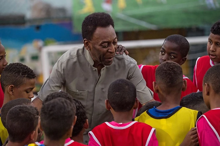 Хотя Пеле никогда не состоял ни в одной политической партии, в 1995 году он стал министром спорта Бразилии и занимал этот пост до 1998 года, когда был принят так называемый «закон Пеле» (lei Pelé). Его главной целью было навести порядок в хаотичных и коррумпированных футбольных структурах страны, а также дать игрокам больше свободы для переходов между клубами. Хотя законопроект был значительно смягчён, как до, так и после принятия, он всё же стал важным шагом вперёд. На этом фото Пеле общается с детьми на открытии футбольного поля в фавеле Минейра в Рио-де-Жанейро в 2014 году.