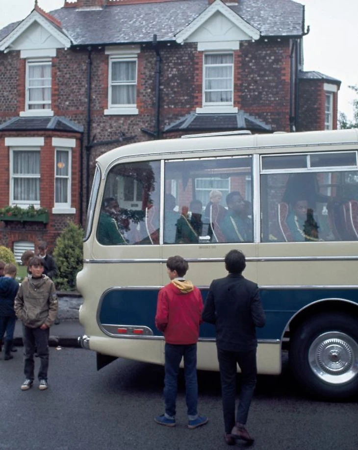На этом снимке автобус сборной Бразилии, в котором едет и Пеле (третий слева), увозит команду с тренировочной базы «Болтон Уондерерс» на Бромвич-стрит 8 июля 1966 года. Изначально бразильцы планировали тренироваться на стадионе «Бернден Парк» во время чемпионата мира, но из-за межсезонья поле оказалось не готово. После обсуждений было решено использовать стадион на Бромвич-стрит, при условии, что команда сможет пользоваться медицинскими услугами «Бернден Парка», а после тренировок им будут подавать кока-колу вместо традиционного чая.