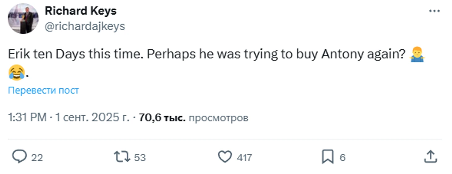 «На этот раз Эрик десять Дней [игра слов ten Hag и ten Days]. Возможно, он снова пытался купить Антони?»
