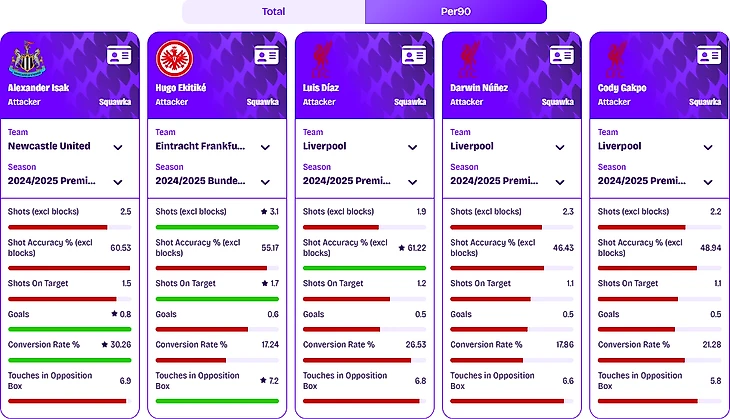 Исак также лидировал по проценту реализации моментов — 30,26%. Диас (26,53%) и Гакпо (21,28%) также преодолели 20-процентный рубеж. Показатели Нуньеса (17,86%) и Экитике (17,24%), напротив, разочаровывают.