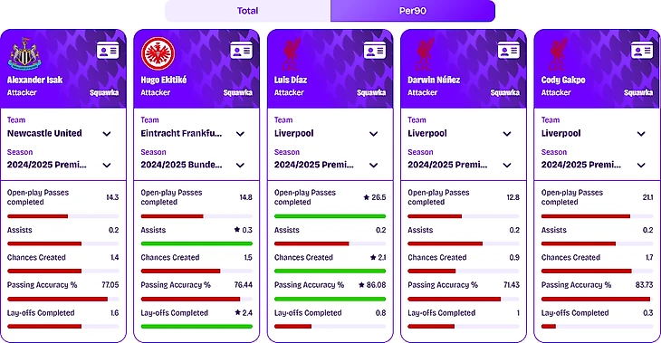 Исак также демонстрирует достаточно низкий показатель успешных передач в игре — 14,3 за 90 минут, и только Нуньес (12,8) показывает худший результат. Экитике в Бундеслиге был ненамного выше — 14,8 передач за 90. Все эти цифры довольно низки для нападающих. Диас (26,5) и Гакпо (21,1) в среднем превышают 20 передач, и вновь свою роль сыграло их время на фланге.