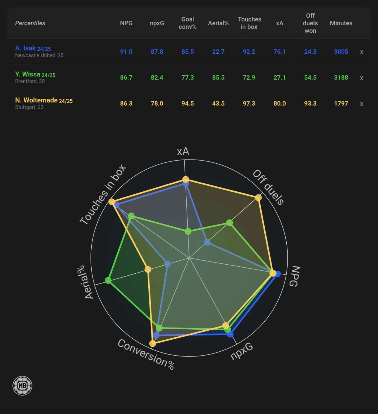 Висса — шестой лучший бомбардир АПЛ прошлого сезона. Конголезец хорошо находит моменты — немного лучше Исака по xG на удар. Он также, как и Вольтемаде, гораздо лучше Исака в верховых дуэлях и в целом в физике. В то же время, швед гораздо лучше в подыгрыше. Однако сам факт траты такой суммы на 29-летнего — очень неоднозначный выбор.