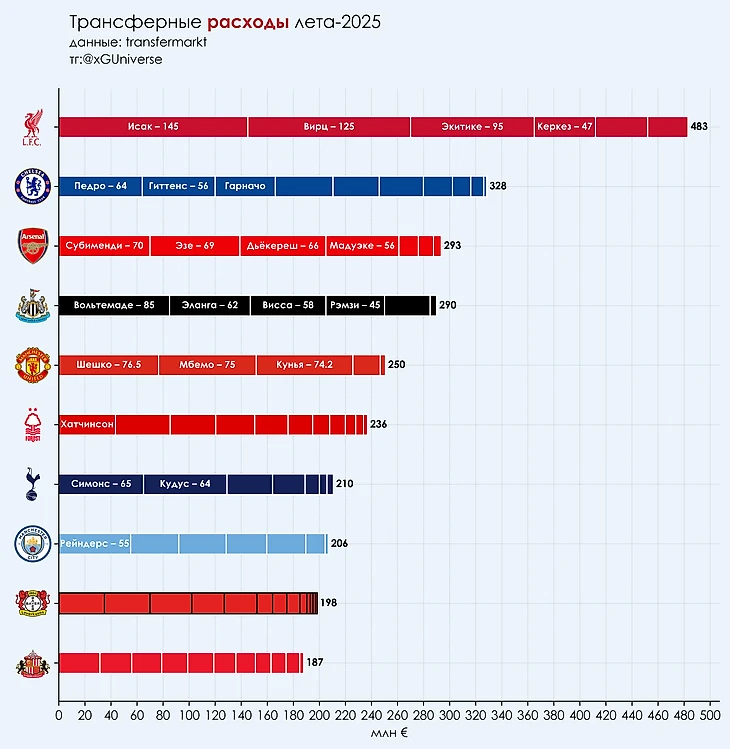 Здесь с гигантским отрывом лидирует «Ливерпуль» — за это лето клуб успел два раза побить рекорд самого дорогого трансфера АПЛ, но оформить трансфер Марка Гехи не успел, с ним у «красных» было бы больше полумиллиарда потраченных евро за лето. В итоге у «Ливерпуля» три самых дорогих трансфера этого лета — Исак, Вирц и Экитике.