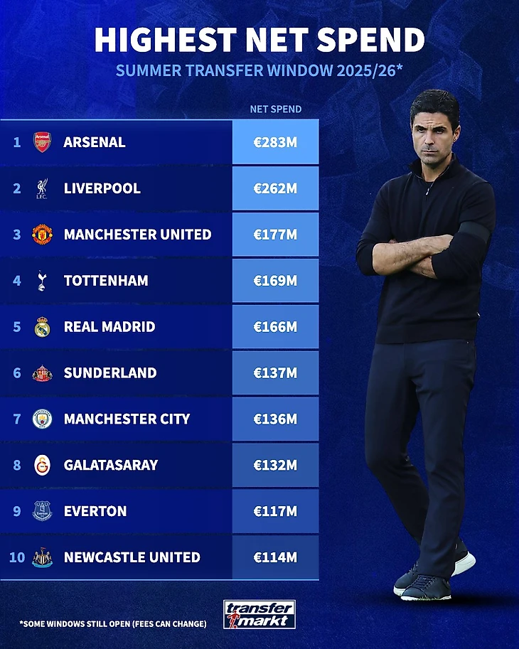 Как подсчитал Transfermarkt, летом наибольшее чистые траты (траты на новичков минус прибыль с продаж) остались за «Арсеналом» – 283,2 миллиона евро. «Канониры» потратили на новых футболистов 293,5 млн евро – это третий показатель в мире, но на продажах лондонцы заработали всего около 10 млн евро.