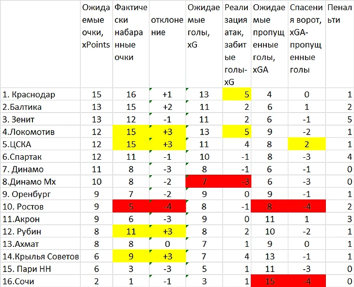 С началом первой паузы в сезоне РПЛ в связи с играми сборных самое время возобновить анализ суммарных результатов продвинутой статистики за прошедшие 7 туров. Как обычно итог представлен в виде таблицы, места в которой клубы занимают исходя из суммы ожидаемых очков xPTS. Но для большей наглядности в нее внесем и некоторые изменения. В частности. поскольку в итоговом обзоре сезона прошлого мы установили очень большое влияние количества пенальти в пользу одной (или нескольких) команд относительно среднего показателя по турниру, их количество представлено отдельным столбцом, а не в виде отношения xG/NpxG.Также, в отличие от уже упомянутого обзора прошлого сезона, пока не будет столбца с «ошибками судей». Но не из-за снижения их влияния на результат. Просто 7 тур оказался очень на них богат, но было несколько спорных моментов, по аналогам которых уже были Решения ЭСК. И итоговый баланс зависит от того, насколько последовательными будет ДСИ РФС в оценке событий последнего тура. Не то чтобы мы сильно опирались на эти Решения - просто было бы глупо считать ошибками последовательно поддержанные ими судейские подходы, пускай и противоречащие Правилам игры. А вот если ЭСК по своей обычной манере одинаковые моменты оценит по разному - тогда уже можно будет делать выводы, опираясь только на Правила игры. Как всегда лучшие показатели выделены золотом, худшие - алым.