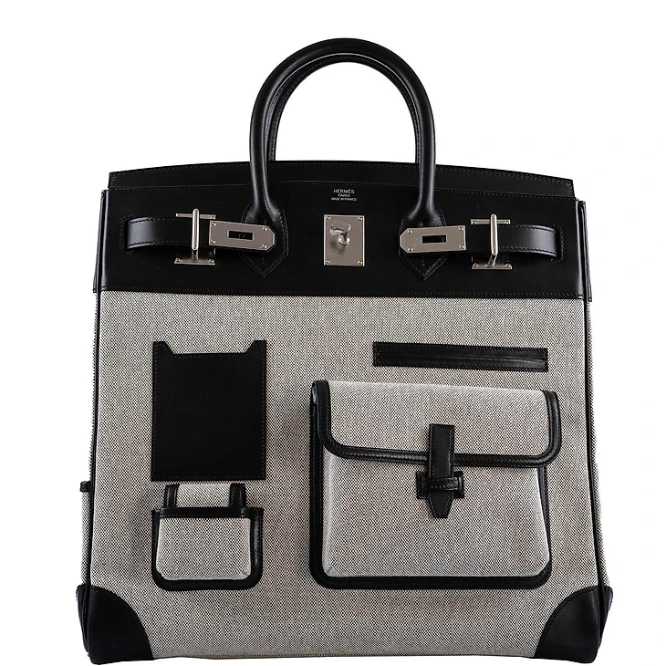Сумка вдохновлена армейской одеждой. Главная фишка – функциональные карманы и аксессуары. Есть вместительные внутренние отделы, боковые и передние кармашки и даже съемный держатель для стакана. Для производства использовали сочетание белого канваса Toile (особый вид ткани, родом из Франции) и черной фирменной кожи Hermès.