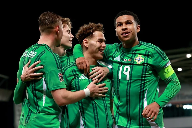 Сборная Северной Ирландии: Бэйли Пикок-Фаррелл, Оуэн Тоул, Трэй Хьюм, Пэдди Макнейр, Алистер Маккэнн, Ши Чарльз, Конор Брэдли, Итан Гэлбрейт, Джастин Девенни, Джейми Рид, Айзек Прайс.
