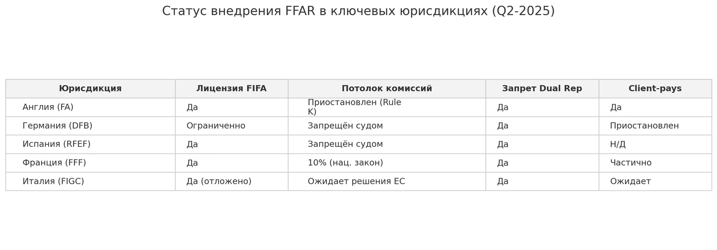 Запрет двойного представительства Франция ввела ещё раньше на национальном уровне, поэтому он согласуется с FFAR. Но по комиссии Франция демонстрирует самостоятельность: вместо 3/6% – по-прежнему максимум 10% (что, к слову, тоже предмет спора: профсоюз игроков считает и 10% слишком много). Таким образом, Франция имплементировала FFAR частично: лицензирование, прозрачность – да, комиссии – нет (оставлены на уровне национального закона).