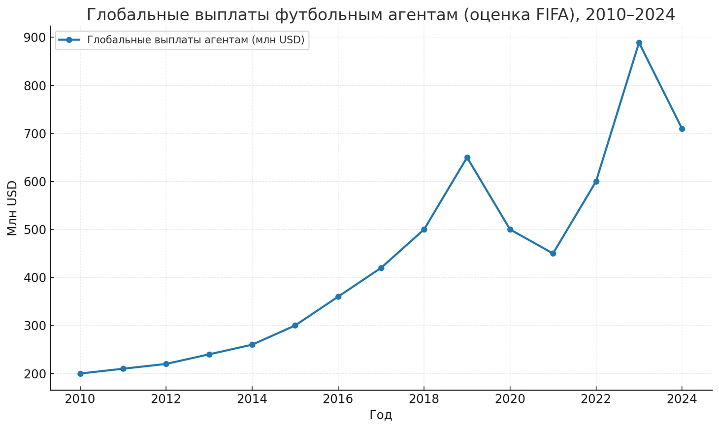 По данным FIFA, в 2023 году совокупные выплаты агентам побили исторический рекорд – порядка $889 млн, что составило около 9,2% от общей суммы трансферов. После объявления новых правил и в период их частичного внедрения в 2024 году расходы клубов на услуги агентов снизились более чем на 20% – до $709,6 млн (примерно 8,3% от глобальных трансферных затрат). График ниже отражает динамику общемировых выплат агентам за последнее десятилетие, включая пик 2023 г. и спад в 2024 г.: