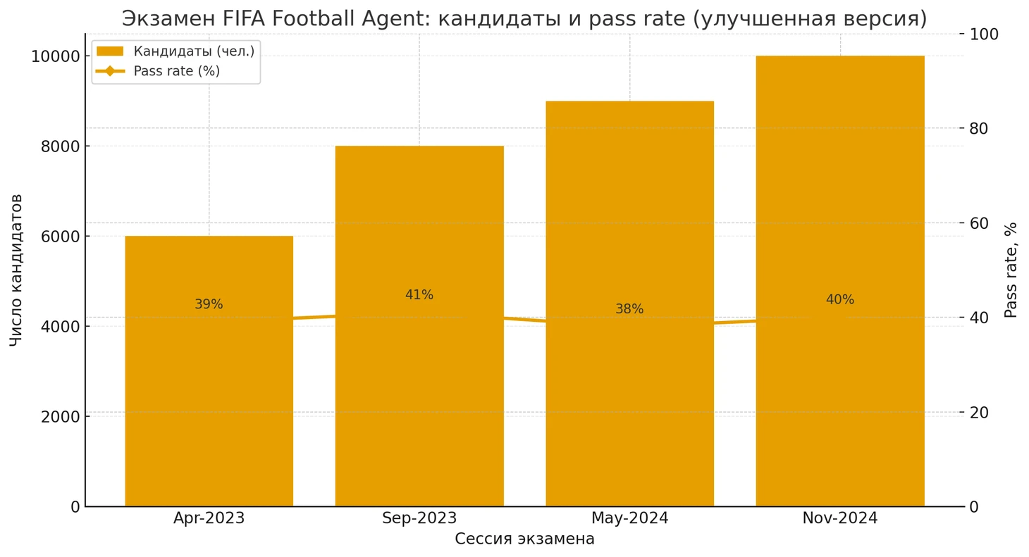Отдельно стоит отметить влияние реформы на общую активность агентов. Поскольку новые требования довольно строги (экзамен, лицензионный взнос, CPD), часть прежних посредников могла уйти с рынка, не сумев получить лицензию. По данным FIFA, к декабрю 2024 года было подано почти 20 тысяч заявок на лицензирование агентов, экзамен сдали ~10 887 человек, и только 40,4% из них успешно получили лицензию. То есть около 4 400 новых лицензированных агентов вступили на рынок, в том числе многие “старые” агенты, а тысячи претендентов не прошли отбор.