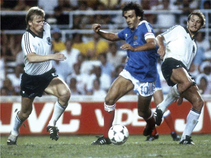 Франция 1982 г. Мишель Платини отмахивается от двух игроков сборной Германии в полуфинале чемпионата мира по футболу 1982 года. Команда Платини была жестоко лишена шансов на выход в финал из-за ужасного единоборства вратаря Харальда Шумахера с Патриком Баттистоном.