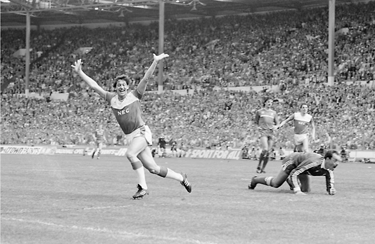 «Эвертон» 1986 г. Гари Линекер несется от ворот после того, как вывел «Эвертон» вперед в финале Кубка Англии против «Ливерпуля». Линекер провел впечатляющий сезон в составе Ирисок, но после чемпионата мира 1986 года был продан в «Барселону».