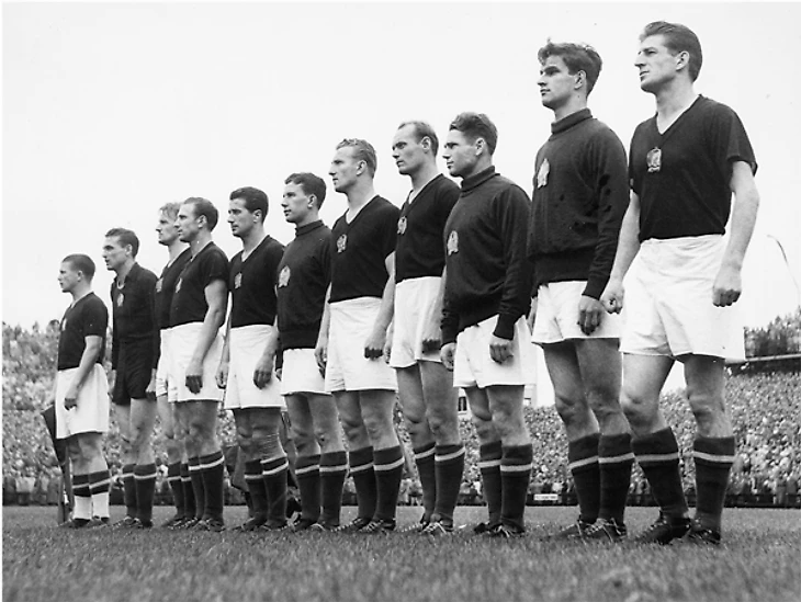 Венгрия 1954. Золотые, могучие мадьяры, которые должны были выиграть Кубок мира. Ференц Пушкаш (крайний слева) – капитан команды.
