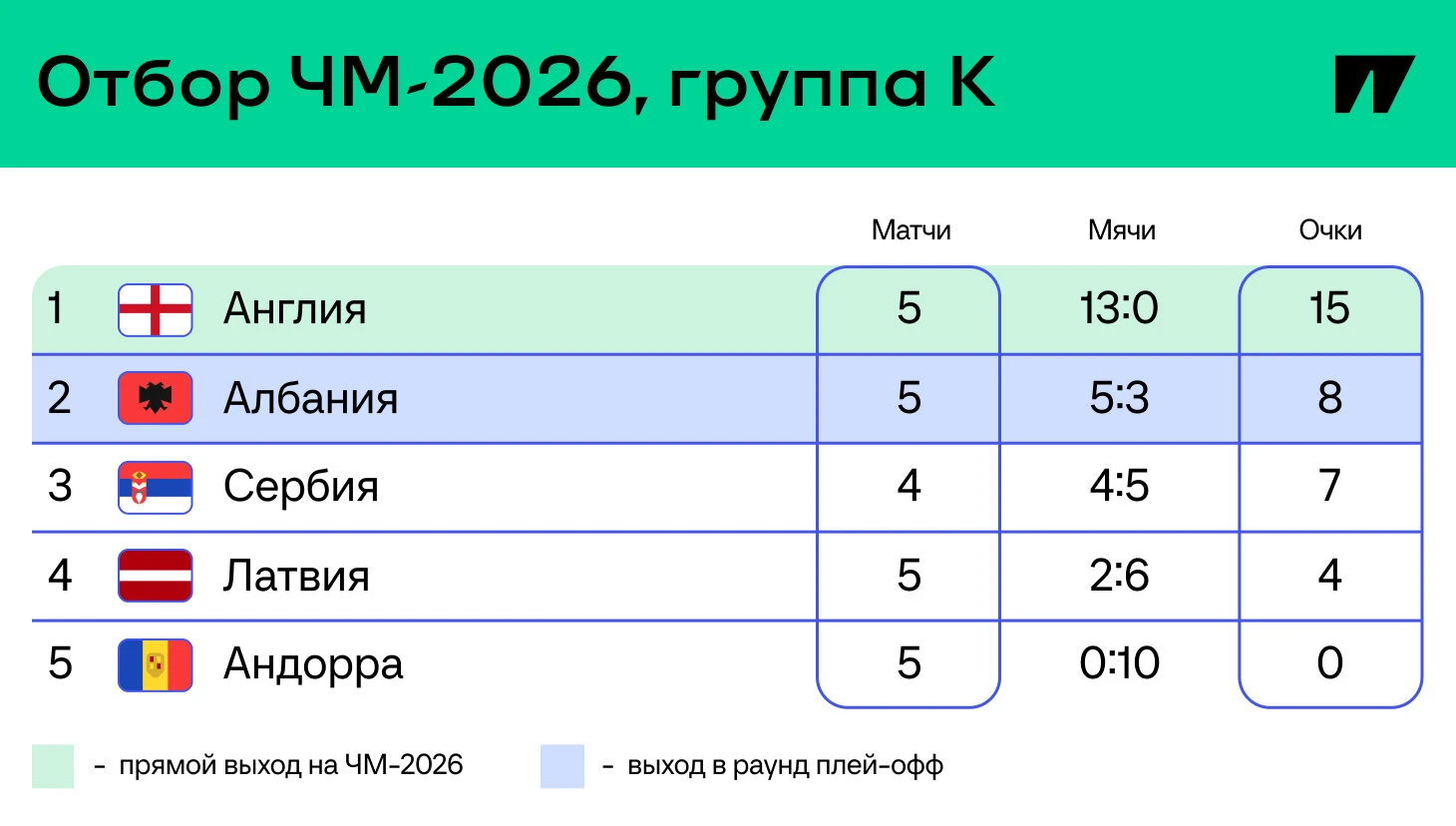 11 октября состоятся игры Латвия – Андорра и Сербия – Албания, а 14-го – Латвия – Англия и Андорра – Сербия.